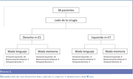 El 73.7% presentó EMT definida y 13.2% signos de EMT, ambos por reporte de RM. La zona epilep-togénica más común fue temporal (97.3%), 37.8% derecha, 32.4% bitemporal y 29.7% izquierda. La figura 1 muestra la distribución por grupos de acuerdo al lado de la cirugía y distribución de la dominancia para lenguaje y memoria otorgada por el test de Wada.