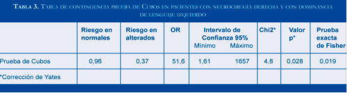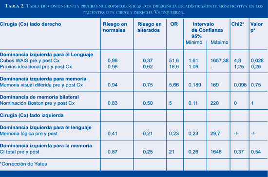 La tabla 1 contiene los resultados del análisis en muestras pareadas de las pruebas neuro psicológicas, discriminando aquellos con cirugía derecha e izquierda. Acá se puede notar que hay diferencias estadísticamente significativas en el perfil neuropsi-cológicas para cubos, span visual, praxias ideomo-toras e ideacionales. La tabla 2 presenta las pruebas neuropsicológicas con diferencias estadísticamente significativas previa y posterior a cirugía, con estimativos del OR. Se anexa tabla 2x2 de la única prueba que reportó un OR significativo del grado de asociación (Tabla 3). El OR para cubos posee una desviación estándar alta, reflejando que la diferencia presente, puede explicarse por la heterogeneidad en las puntuaciones de las personas evaluadas; aspecto que debe tenerse en cuenta.