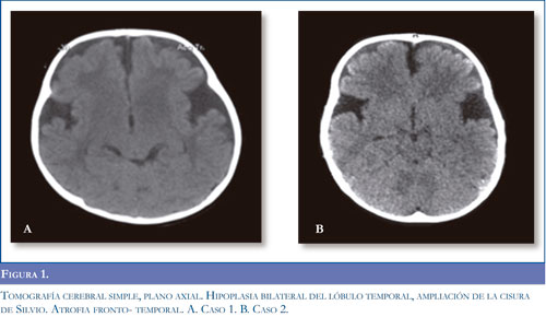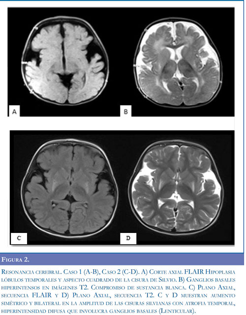 Neuroinfección, la cual se descartó por análisis de líquido cefalorraquídeo, se inició manejo anticonvulsivante con fenitoína y fenobarbital ante la sospecha de crisis epiléptica; sin obtener mejoría. Presentó síntomas respiratorios, con radiografía de tórax que mostró opacidad alveolar derecha y hemograma con aumento de leucocitos a expensas de neutrófilos, por lo cual se inició tratamiento antibiótico. Se remitió a Hospital de III nivel para manejo especializado. Al examen neurológico se encontró alerta, irritable, con sialorrea, nistagmus horizontal, hipertonía generalizada, hiperextensión de extremidades y cabeza, hiperreflexia con clonus aquiliano bilateral, respuesta plantar extensora bilateral, movimientos distónicos, y pérdida de las habilidades motoras previamente alcanzadas. Se realizó electroencefalograma sin evidencia de actividad paroxística epileptiforme, y se suspendieron los anticonvulsivantes. Las imágenes de tomografía axial computadorizada de cráneo (TC) evidenciaron atrofia bilateral de lóbulo temporal (Figura 1A). Con impresión diagnóstica de encefalopatía con disquinesia de probable origen metabólico se inició manejo con diazepam para control de crisis distónicas. Se realizó resonancia magnética (RM) cerebral evidenciando hipoplasia fronto-temporal, con aumento del tamaño de las cisuras silvianas, retardo en la mielinización y alteración de la señal en ganglios basales (Figura 2).