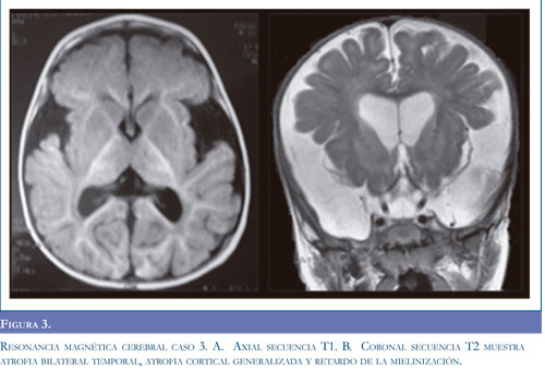 Caso 3. Escolar masculino producto de segunda gestación, controles prenatales normales, parto espontáneo, al nacer APGAR bajo y síndrome de dificultad respiratoria que requirió ventilación mecánica con evolución satisfactoria. Sostén cefálico a los 2 meses, sedente a los 6 meses; a los 9 meses presentó cuadro febril secundario a infección respiratoria alta que requirió hospitalización donde se documentó luego del cuadro viral pérdida de las habilidades adquiridas en el neurodesarrollo. Se valoró meses después en consulta de neuropediatria, se solicitó RM cerebral que mostró atrofia cortical difusa con quistes aracnoideos bilaterales temporales (Figura 3), se sospechó enfermedad metabólica y se solicitó cromatografía de aminoácidos en orina y plasma reportados normales, cromatografía de ácidos orgánicos en orina donde se documentó excreción elevada de ácido glutárico y de 3 hidroxiglutárico. La confirmación diagnóstica se realizó a los 18 meses de edad y se inició manejo nutricional con restricción proteica, multivitaminas y suplementación con L-carnitina y plan de habilitación. Presentó múltiples episodios de descompensación metabólica por manejo nutri-cional irregular, cuadros febriles, cursó con eventos de microaspiración y pérdida progresiva de peso, se realizó gastrostomía a los 2,5 años de edad. La enfermedad progresó clínica e imagenológicamente con aumento de las crisis distónicas sin respuesta a manejo farmacológico y fiebre de origen central. En la actualidad cursa con cuadriparesia discinética, retardo mental profundo. Evaluación funcional motora nivel V, 10,4%.
