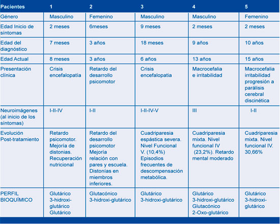 Glutaric aciduria type i is a disorder resulting trom the deficiency ot the glutaryl-CoA dehydrogenase, enzyme involved in the catabolism ot L-lysine, L-hydroxy-lysine y L-tryptophan causing the accumulation ot its derivatives glutaric acid and 3-hydroxy-glutaric acid which are responsible tor the severe neurological involvement observed in this disease. The diagnosis ot metabolic disorders represents a challenge tor health-care services given its low incidence. Glutaric aciduria type I is a disease tor which there are available technical resources tor diagnosis as well as the nutritional therapy that when set prior to acute encephalopathy, who results in irreversible damage ot central nervous system, can improve the prognosis and decrease the disability ot patients. This publication report 5 cases with clinical and biochemical diagnosis ot glutaric aciduria type i that show the clinical spectrum the diagnostic and treatment approach ot this pathology in Colombia. All the patients are being followed by neuropediatrics services.