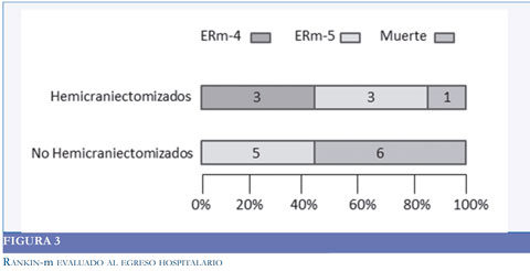 El estudio describe las consideraciones tomadas en cuenta para la decisión de realizar o no Hemicra-niectomía y el análisis de la evolución clínica y mortalidad, y el compromiso neurológico al momento del egreso evaluados por la escala de Rankin modificada (M-RS) y la escala de Barthel.