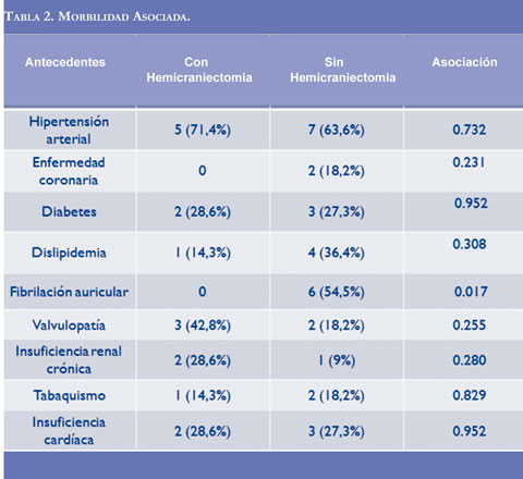 Resultados:: se recolectaron 18 pacientes con ACV extenso, a 7 (38,8%) se les realizó HD y a 11 (61,1%) se les dio manejo médico convencional. La etiología del ACV más frecuente en ambos grupos fue la cardioembólica (61%), no hubo diferencias en cuanto a la severidad del ACV medida por escala NIHSS. Todas las HD se realizaron en las primeras 48 horas. La mortalidad en el grupo con HD fue de 14,2% mientras en el grupo con manejo médico convencional fue 54,5%. En cuanto a la funcionalidad al egreso hospitalario se observó una menor discapacidad en el grupo de HD comparado con el grupo sin HD (Rankin-m p=0,08 y Barthel p=0,03).