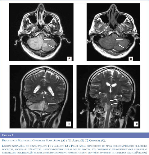 Paciente masculino de 35 años de edad, ingresó a nuestra institución con tres días de evolución de alteración senstiva en hemicuerpo derecho, evolucionó en un tiempo aproximado de cinco horas a perdida completa de la fuerza ipsilateral. Adicional-mente refirió cefalea de aparición súbita, localizada en región parietooccipital de intensidad moderada, no irradiado y sin modificación de patrón de dolor con cambios posturales, asociada a vértigo objetivo, diaforesis, visión borrosa, diplopia y emesis. No hubo compromiso del estado de conciencia. Los síntomas descritos aparecieron luego del accidente automovilístico menor.