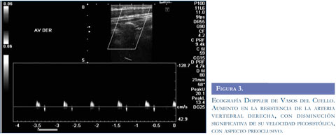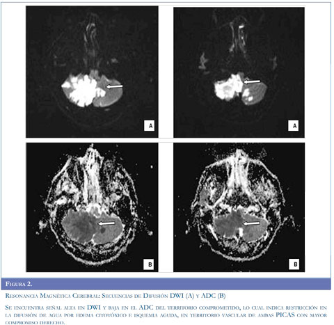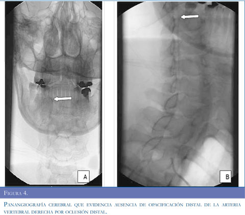 Con los argumentos descritos se realizó estudio de resonancia magnética del cerebro (Figuras 1 y 2) que evidenció infarto isquémico agudo del territorio de la arteria cerebelosa posteroinferior derecha (PICA), ecografía Doppler de vasos del cuello (Figura 3) que muestró aumento de las resistencias de las curvas obtenidas en la arteria vertebral derecha, con disminución significativa de su velocidad picosis-tólica y curvas con aspecto preoclusivo por lo cual se sospechó disección de la arteria vertebral. Se realizó panangiografía cerebral (Figura 4) que concluyó en disección de la arteria vertebral derecha con oclusión distal permitiendo aceptar la hipótesis planteada.
