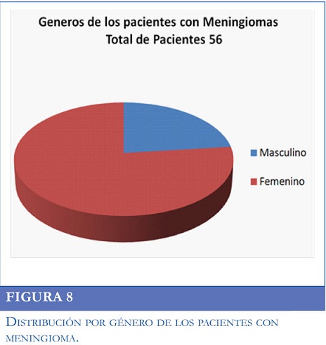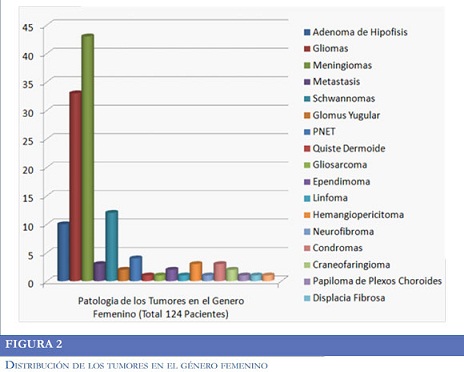 Hay tumores que se presentan más comúnmente en las mujeres, por ejemplo, los meningiomas son 80% más frecuentemente en el género femenino (7,10). Similar a la publicaciones mundiales, en esta serie los meningiomas constituyeron el 76.79% de las lesiones que se presentaron en el género femenino.