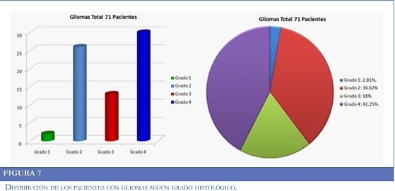 Los glioma grado 1 corresponden al 2.81%, los de grado 2, al 36.62%, los de grado 3 al 18% y finalmente, los glioblastomas multiformes o gliomas grado 4 se encontraron en el 42.25% de los casos (Figura 7). Hubo una distribución equitativa de los pacientes de género femenino y aquellos masculinos entre las muestras de glioblastoma multifome.
