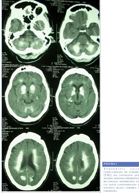 This is the case of an patient with convulsive episodes, abnormal movements and cognitive deficit of several months of evolution. The axial computed tomography demonstrated injuries ganglion basal, paraventriculares, white substance and cerebellum; presenting clinical symptoms of Fahr’s disease and with laboratory studies that reject other pathologies of similar characteristics.
