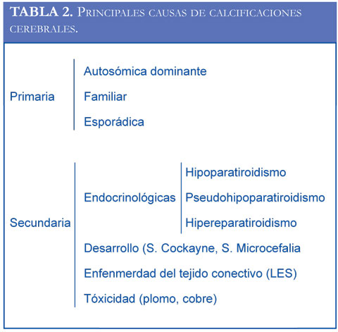 La enfermedad de Fahr está asociada con una transmisión hereditaria de forma autosómica dominante, localizada en el brazo corto del cromosoma 14; que producen calcificaciones en ciertas aéreas cerebrales como la zona periventricular, los ganglios de la base y el cerebelo. De la misma manera, se han descrito casos esporádicos como el de este reporte; donde no se evidenció relación heredofamiliar. Cuando dichas calcificaciones cerebrales no se acompañan de problemas metabólicos se establece el síndrome de Fahr (6-9) (Tabla 2).