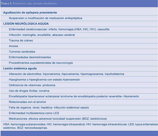 Alrededor del 33-50% de los casos de EE ocurren en pacientes sin historia previa de epilepsia en el contexto de una condición aguda del sistema nervioso central, entre ellas ACV (20-36%), trauma de cráneo (1-26%), alteraciones metabólicas o abstinencia de sustancias tóxicas (7-26%), infecciones del sistema nervioso central (3-14%) o tumores (5-24%) (1,2,4) (Tabla 1).