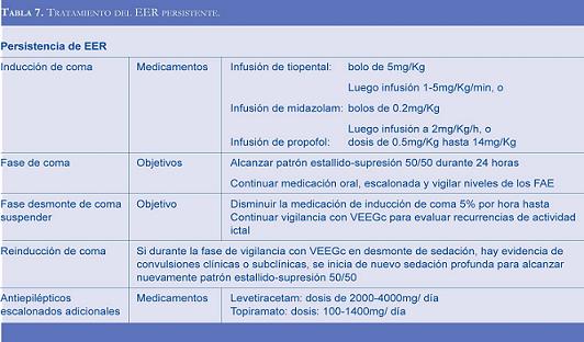 El manejo del EER está basado en reportes de casos o experiencia de centros especializados. Se recomienda la eliminación de la actividad ictal electrográfica con la inducción, por medio de sedación, de un patrón estallido-supresión farmacológico; siendo una segunda alternativa, un manejo menos agresivo, sin sedación usando altas dosis de antiepilépticos, en una forma escalonada, y guiado con la mejoría observada en el VEEGc (23-30).