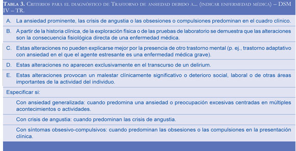Se sabe que los pacientes con epilepsia tienen una probabilidad mayor que la población general de padecer un trastorno psiquiátrico; los trastornos mentales que más comúnmente acompañan a la epilepsia son: la ansiedad (19%-21% de los casos), la depresión (11%), y la psicosis (9%) (13). En nuestro caso el diagnóstico se tipificó, dentro del DSM IV-TR, como trastorno de ansiedad secundario a enfermedad médica con crisis de angustia, ya que a partir de la historia clínica y las pruebas diagnósticas, se determinó que las crisis son consecuencia directa de una enfermedad médica - epilepsia (Tabla 3) (5).