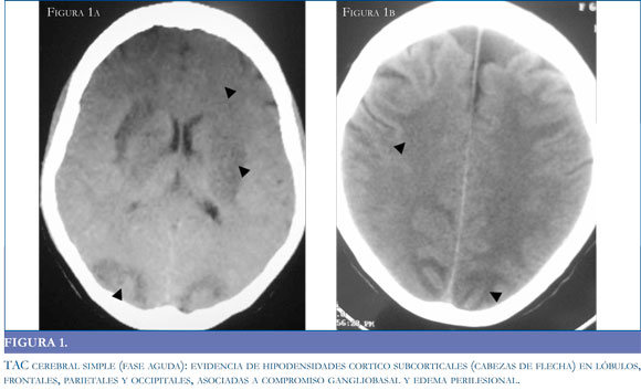 La tomografía puede no ser el método de elección en consideración a sus características operativas, pero es un recurso de fácil acceso para la aproximación diagnóstica. Si bien la tomografía puede ser negativa en la etapas tempranas del síndrome (39), está documenta la presencia de lesiones hipodensas habitualmente simétricas1 en la sustancia blanca de los territorios posteriores y gangliobasales (34) (Figuras 1 a y b); con el desenlace clínico de la patología, las imágenes tomográficas muestran una resolución de las hipodensidades descritas en el momento de mayor intensidad clínica (Figuras 2 a y b).