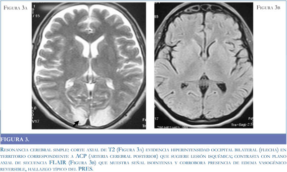 El síndrome de encefalopatía posterior reversible está relacionado con un sin número de factores de riesgo en donde la lesión endotelial (9,10) y el compromiso en la perfusión cerebral son el común denominador5. Durante la gestación y el puerperio, la pre-eclampsia y el síndrome de HELLP (H: Hemolytic anemia, EL: Elevated Liver, LP: Low Platelet) son los principales desencadenantes de esta encefalopatía (11-14); con menor frecuencia se ha reportado su asociación a entidades que pueden coincidir o anteceder al embarazo, como es el caso del síndrome hemolítico urémico, la insuficiencia renal crónica, la hipercalcemia (1), el lupus eritematoso sistémico, la púrpura trombocitopénica, la neuroinfección (15), la sepsis severa, la quimioterapia (16), la intoxicación alcohólica (17), la porfiria intermitente aguda9 y la punción lumbar inadvertida de la duramadre durante la analgesia obstétrica (10,18). Curiosamente, las pacientes con hipertensión arterial crónica no son proclives a padecer de esta entidad en virtud de los cambios adaptativos desarrollados (16).