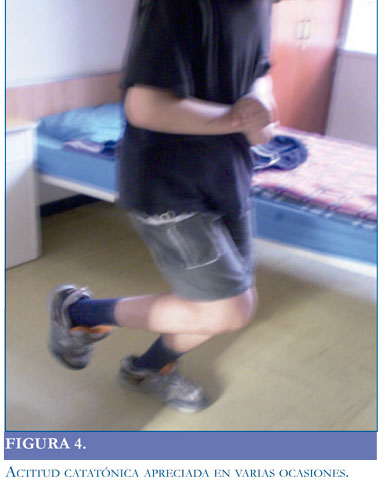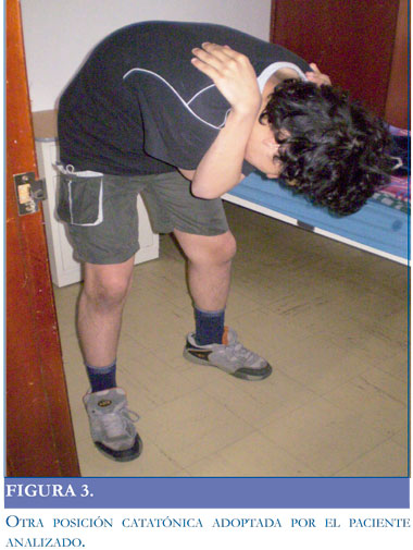 Paciente de 21 años, con antecedente de trastorno psicótico no especificado, valorado inicialmente en el servicio de urgencias psiquiátricas con cuadro de un año de insomnio de conciliación, hiporexia, ideas paranoides, alucinaciones auditivas, comportamiento extravagante, episodios de agresividad hacia los padres, se izo diagnóstico de esquizofrenia indiferenciada y se inicia manejo con clozapina 150mg/dia. Asistió nuevamente a urgencias seis meses después, por cuadro de tres meses de evolución caracterizado por insomnio global, además pérdida del cuidado personal, aislamiento social, mutismo, movimientos de balanceo del tronco, y posturas fijas (posición sentado la mayor parte del día) se reformuló diagnóstico de esquizofrenia indiferenciada por antecedentes, se inició manejo fluoxetina 20mg/día, lorazepam 1 mg/ noche, risperidona 3mg/noche. Presentó mejoría parcial de mutismo, negativismo y actitud alucinatoria y fue dado de alta. Presentó nuevamente cuadro de 10 días de evolución de síntomas similares a los de la anterior hospitalización, se modifica manejo a fluoxetina 20mg/dia, clozapina 200mg/noche, lorazepam 2mg día con pocos cambios, se planteó utilizar terapia electroconvulsiva bajo anestesia general y relajación neuromuscular (TECAR) la cual no fue autorizada por familiares, de alta sin nuevos episodios de agitación, con mejoría del patrón de sueño, alimentación y sin ideas delirantes. Continuó manejo en consulta externa durante 11 meses con dificultades en la adherencia a medicamentos y retornó al servicio de urgencias psiquiátricas, con cuadro de 20 días de reactivación de síntomas. El paciente presentaba posturas extrañas (Figuras 1 2, 3 y 4), mutismo global, mirada fija y rechazó la medicación y a los alimentos (líquidos o sólidos).