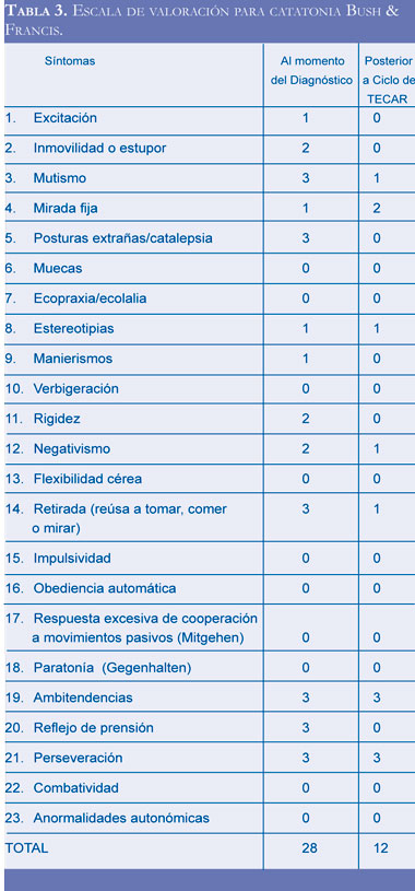 Sus constantes vitales eran normales al momento del ingreso y no presentaba hipertermia o cambios disautonómicos. Se mantuvo diagnóstico de esquizofrenia indiferenciada, por curso longitudinal previo con evidencia de síntomas catatónicos actuales y poca respuesta a medicación. Se decidió aplicar la escala de Bush- Francis con un puntaje permanente de 27 lo cual confirmaba la presencia de síndrome catatónico. Se suspendieron antipsicóticos, se planteó nuevamente realizar TECAR, se administraron 10 sesiones, al terminar aceptó la parcialmente vía oral con mayor aceptación de medicamentos dados con jeringa y hubo emisión de lenguaje, persistió balanceo y negativismo parcial. Al terminar el ciclo de TECAR fue manejado con amantadina 200mg/día más lorazepam 0,5mg/ noche. Dentro de los antecedentes se destacó que el paciente era producto de parto domiciliario que presentó cianosis y requirió observación por 24 horas, con desarrollo psicomotor adecuado excepto por control de esfínteres el cual alcanzó parcialmente a los 4 años, buen rendimiento escolar hasta los 10 años cuando disminuyó, a los 13 años presentó aislamiento social y a los 15 años fue retirado del colegio por pérdida del control de esfínteres mientras cursaba 9 grado. La resonancia magnética realizada durante la hospitalización fue reportada como normal.