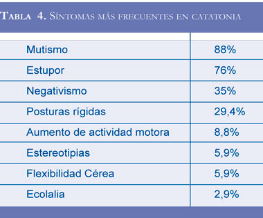 La frecuencia de presentación de los síntomas ha estado dominada por las posiciones extrañas y la flexibilidad cérea, las cuales hicieron célebre esta patología, pero contrario a lo esperado son los síntomas comportamentales los más frecuentes (12) (Tabla 4) y quizás los menos llamativos; además de tener en cuenta la presentación de síntomas parciales (limitados a una extremidad, parte del cuerpo o función) o generalizados (todo el cuerpo) (5) y que además implica, severidad en la presentación del cuadro. También es posible observar los síntomas como negativos y positivos (16), como respuesta a factores externos e internos del individuo.