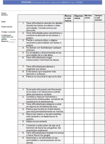A los padres y maestros de los niños seleccionados se les solicitó el autodiligenciamiento del cuestionario de tamizaje de lista de síntomas del DSM IV (Anexo) y el consentimiento informado. Los padres fueron citados al colegio o escuela, donde luego que se les realizó una corta inducción acerca de la forma adecuada de llenar el formulario, respondieron el cuestionario. A los padres que no asistieron se les envió el cuestionario a la casa empleando los mecanismos de cada institución. Los que no lo respondieron fueron visitados en el hogar. Los maestros respondieron los cuestionarios de cada uno de los alumnos pertenecientes a su grupo.
