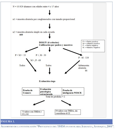 El cálculo del tamaño de la muestra se realizó para la evaluación de prevalencia del TDAH; el número de estudiantes que constituían el universo en el año 2001 fue de 10.929. Se utilizó un nivel de confiabilidad del 95%, correspondiente con un alfa del 5%, error máximo permisible del 4%, correspondiente a un poder del 96%, y una prevalencia del 20%. Al valor obtenido de 371 se le adicionó un 10%, previendo las pérdidas, para una muestra de 408. Finalmente, se evaluaron 460 niños y adolescentes, ya que el nivel de pérdidas fue inferior al esperado, y además, por haber resultado los grupos escolares con un promedio de alumnos superior al calculado durante la etapa del diseño del estudio.