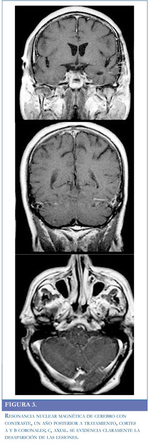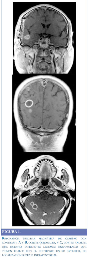 Se hospitalizó para estudio de síndrome parietal derecho y posible ataque cerebrovascular. Laboratorios iniciales, hemograma y química sanguínea, normales. Se tomó resonancia magnética de cerebro simple y contrastada, revelando múltiples lesiones de tamaños variados que comprometían ambos hemisferios cerebrales, la mayoría en el lado derecho, de apariencia redondeada y marcado edema a su alrededor, con realce en patrón anular, y una en hemisferio cerebeloso de similares características que sugieren lesiones metastásicas (Figura 1). En estudios de extensión se encontró en tomografía de tórax una opacidad en el segmento posterior del lóbulo inferior izquierdo con amputación de la luz bronquial para segmentos inferiores del lóbulo inferior. Hasta ese momento el paciente estaba enmanejo anticonvulsivante y analgésico. Se realizó biopsia de pulmón, la cual no fue conclusiva de lesión primaria infecciosa o inflamatoria, considerándose lesión cicatricial a su antecedente de tromboembolismo pulmonar. Los reportes del líquido cefalorraquídeo, incluidos citoquímico, hongos, tuberculosis, criptococo, antígenos bacterianos en la sangre; las pruebas para toxoplasmosis IgM e IgG, y VIH, fueron negativas. En el séptimo día de hospitalización la cefalea se intensificó y se encontraron signos de hipertensión endocraneana dados por diplopía y emesis. Se trasladó a unidad de cuidado intensivo y se inició manejo con esteroides y manitol a dosis adecuadas. Se estabilizó el cuadro y se decidió realizar biopsia cerebral guiada por estereotaxia (lesión parieto-occipital derecha); se aspiró material purulento, pero en el reporte definitivo no se hallan cultivos positivos ni malignidad en la patología. En ese momento el paciente no tenía diagnóstico y por resultado macroscópico de biopsia se inició antibioticoterapia endovenosa de amplio espectro: ceftriaxona, vancomicina, metronidazol, trimetroprim sulfametoxazol (TMP/SMX) y caspofungina.