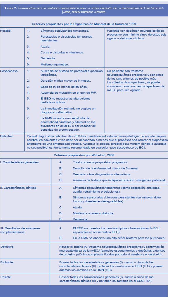La nvECJ es producida por el consumo de carne vacuna contaminada por priones o por transfusión de sangre contaminada; hasta la fecha todos los casos de nvECJ han sido homocigóticos para metionina en el codón 129 (M/M) del gen PRNP, significando que para sufrir la enfermedad se debe consumir carne procedente de reses afectadas con encefalitis espongiforme bovina (EEB) y además poseer predisposición genética para sufrir la enfermedad; no obstante, también es posible que el tiempo de incubación para quienes portan un genotipo diferente al 129 M/M sea más prolongado y aún no se hayan reportado casos con genotipos distintos. La gran mayoría de los casos han sido reportados en Reino Unido, pero también han ocurrido en Francia, Irlanda, Italia, Holanda, España, Estados Unidos, Canadá y Japón (56-60). La enfermedad se presenta en individuos con un promedio de edad de 29 años (para un rango de edad de 12 a 74 años); desde el consumo del alimento contaminado hasta la aparición de la enfermedad pasa un tiempo de 15 a 20 años, y la enfermedad tiene una duración aproximada de 15 a 25 meses (37, 61, 62). Clínicamente la nvECJ se caracteriza por predominio de alteraciones conductuales y psiquiáticas y en algunos casos hay marcados trastornos sensoriales (disestesias o dolor en extremidades o cara); frecuentemente la queja inicial es de tipo psiquiátrico, siendo más común la depresión, pero también son frecuentes la ansiedad, el retraimiento y los cambios de comportamiento. Otros signos y síntomas observados son; delusiones, labilidad emocional, agresividad, insomnio, disartria y alucinaciones visuales y auditivas; con frecuencia muchos pacientes desarrollan un síndrome cerebeloso progresivo con ataxia para la marcha y en extremidades; la demencia usualmente se desarrolla en la fase tardía de la enfermedad; los miclonus son frecuentes en los pacientes y en ocasiones están precedidos de corea. Entre los cambios neuropsicológicos observados se presenta un deterioro cognitivo moderado a severo, con afectación de la memoria visual y verbal, disfunción ejecutiva y pérdida de habilidad nominal; el deterioro perceptual es menos frecuente (1, 63, 64). Para el diagnóstico de la nvECJ se han propuesto diversos parámetros que recolectan diferentes criterios diagnósticos (ver comparativo de criterios diagnósticos para nvECJ en la tabla 2), siendo la nvECJ una enfermedad de notificación obligatoria que requiere su respectiva vigilancia epidemiológica (47, 65). Histopatológicamente se diagnostica al encontrar en corteza cerebral y corteza cerebelar múltiples placas floridas por la tinción de hematoxilina eosina, en tinción para PrP se observan numerosos acúmulos de placas pequeñas y acúmulos amorfos de PrP pericelulares y perivasculares; en el estriado se aprecian cambios espongiformes severos y acumulación de PrP axonal y perineuronal; en tálamo y diencéfalo se ve marcada astrocitosis con pérdida neuronal; en tallo cerebral y médula espinal se evidencia acumulación de PrP en forma reticular y perineuronal que afecta la materia gris (47, 66).