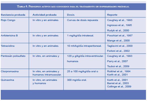 A pesar de haberse probado una gran cantidad de principios activos con efecto antipriónico, a la fecha no hay un tratamiento que cambie significativamente el cuadro clínico de las enfermedades por priones, lo único que se ofrece a los pacientes son cuidados paliativos. Algunas de las sustancias probadas poseen grados variables de efectividad para combatir las enfermedades priónicas (Tabla 4). Sustancias como los compuestos polianiónicos, de los cuales hacen parte los glicosaminoglicanos, entre los que se encuentran el heparán sulfato, la heparina, el dermatán sulfato, el keratán sulfato, el condroitín sulfato o análogos semisintéticos como el pentosán polisulfato y el dextrán sulfato, tienen la capacidad de unirse a PrP y competir con la transformación de PrPC en PrPSc (116-119). De estas sustancias el pentosán polisulfato es un anticoagulante y antiinflamatorio usado en veterinaria, y ya ha sido probado en varios casos humanos, reportando como resultado un aumento en la sobrevida de los pacientes sin detener la progresión de la enfermedad; en estudios comparativos con otras sustancias antipriónicas usadas como quinacrina y anfotericina B se ha recomendado al pentosán polisulfato como el compuesto con mejor resultados al tratamiento. Básicamente esta molécula actúa como un inhibidor competitivo con la PrP, al unirse a la PrPC y a la PrPSc (120-123). El rojo Congo es otra molécula que se une a la PrP, pero en el caso del rojo Congo se une a las formas fibrilares impidiendo la polimerización de las fibrillas y de esta forma detiene la agregación; es poco probable que el rojo Congo pueda ser usado en tratamiento para humanos debido a su alta toxicidad, pero se está trabajando en derivados de esta molécula que pueden tener mejores posibilidades en la terapéutica de enfermedades de depósitos amiloideos como las enfermedades priónicas (124-128).