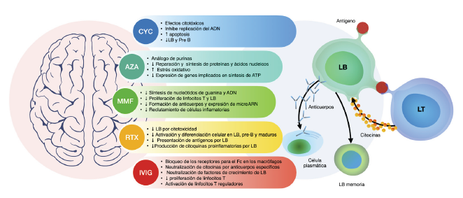 La CYC es un agente alquilante utilizado en el tratamiento de afecciones neurológicas asociadas a enfermedades como el LES, el síndrome de Sjögren, la sarcoidosis y la enfermedad de Behçet. Forma parte de esquemas terapéuticos como el NIH y el CYCLOPS, y entre sus efectos adversos se incluyen la falla ovárica, la reducción del conteo de espermatozoides, así como un mayor riesgo de cistitis y cáncer de vejiga. Por su parte, la AZA, un análogo de las purinas, se emplea en enfermedades como el lupus neuropsiquiátrico y la enfermedad de Behçet, y comparte indicaciones con el MMF. Entre los efectos adversos de la AZA, se encuentran efectos dosis-dependientes como náuseas, vómitos, anorexia e infecciones de diversa índole. Además, su uso puede inducir mielosupresión, especialmente en pacientes con ciertos tipos de mutaciones, lo que resulta en linfopenia o neutropenia, y también puede provocar hepatotoxicidad, principalmente manifestada por una elevación de la GGT.
