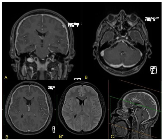 Dentro de los estudios iniciales se evidenció proteína C reactiva (PCR) aumentada (120 mg/l); hemograma, función renal, glucosa sérica y electrolitos normales; estudios para enfermedades infecciosas crónicas negativos (VIH, tuberculosis, hepatitis B, hepatitis C y sífilis); se realizó tomografía de cráneo simple (TAC) sin alteraciones; y se complementó el estudio con una resonancia magnética nuclear (RMN) simple y contrastada, en la que se documentaron signos de paquimeningitis (figura 1).
