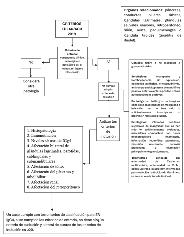 Existen diferentes criterios para el diagnóstico o la clasificación de ER-IgG4, en los cuales, una constante fue demostrar la evidencia clínica o radiológica de compromiso de, al menos, un órgano sumado al criterio histológico. El pilar del tratamiento son los esteroides en dosis intermedias o altas, adicionalmente, cada vez hay más medicamentos inmunomoduladores que pueden disminuir o reemplazar el uso de esteroides en caso de intolerancia o refractariedad.