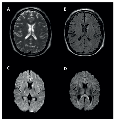 En nuestro caso, se había utilizado cefepime como terapia antibiótica empírica. Este antibiótico beta-lactamico del grupo de las cefalosporinas de tercera generación, ha sido descrito ampliamente como causal de neurotoxicidad; su espectro de manifestaciones va desde encefalopatía, cambios en el estado mental, mioclonías, convulsiones, estado epiléptico no convulsivo y coma; los pacientes con disfunción renal se encuentran dentro de los más susceptibles a la toxicidad, al igual que los de edad avanzada y enfermedad neurológica previa 12. Otra causa identificada es el tramadol, con reporte de asociación y causalidad con trastornos del movimiento, siéndole atribuidas un 25 % de las mioclonías inducidas por opioides 13. En Colombia se han descrito casos de mioclonías asociadas a fármacos opioides y agonistas adrenérgicos como el salbutamol 14,15. El tratamiento farmacológico, en este caso mediante el uso y titulación de levetiracetam, se consideró necesario en el paciente, debido a que se desconocía si las mioclonías obedecían a un origen epiléptico, su frecuencia y gravedad afectaban notoriamente el estado general del paciente, y, en tercer lugar, debido a que el implante de un nuevo catéter y el reinicio de la diálisis se retrasaría hasta que se confirmara la depuración de la bacteriemia, esto por el alto riesgo de infección de un nuevo dispositivo intravascular colocado prematuramente 16. Por último, en el estudio de la etiología de las mioclonías se identificó una lesión isquémica reciente en la cabeza del núcleo caudado izquierdo.
