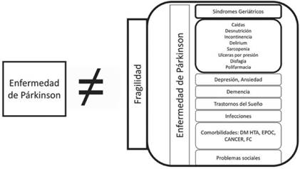 Todos estos factores biopsico-sociales que interactúan en un solo individuo con Enfermedad de Parkinson llegan a configurar en este una nueva y más compleja entidad que si se aborda adecuadamente, se puede prevenir y revertir, evitando así mayores efectos negativos. Esta entidad es la fragilidad (figura 1) 10,11.