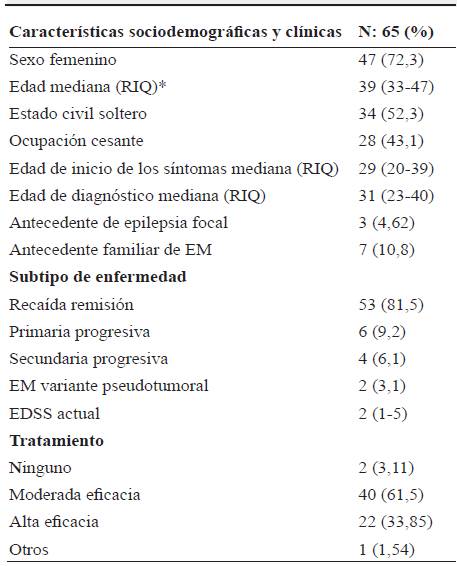 Un total de 65 pacientes fueron incluidos para el análisis de los datos. El 72 % de los pacientes con EM son de sexo femenino. El 52 % están solteros, divorciados o viudos. El tipo EM de recaída y remisión se presenta en 81 %, la forma progresiva en un 15 % y la variante pseudotumoral en un 3 %. El 4 % de los pacientes presentan asociado un diagnóstico de epilepsia, como comorbilidad relevante (tabla 1).