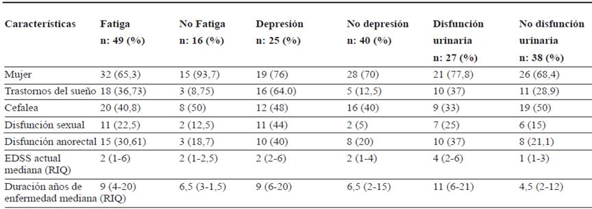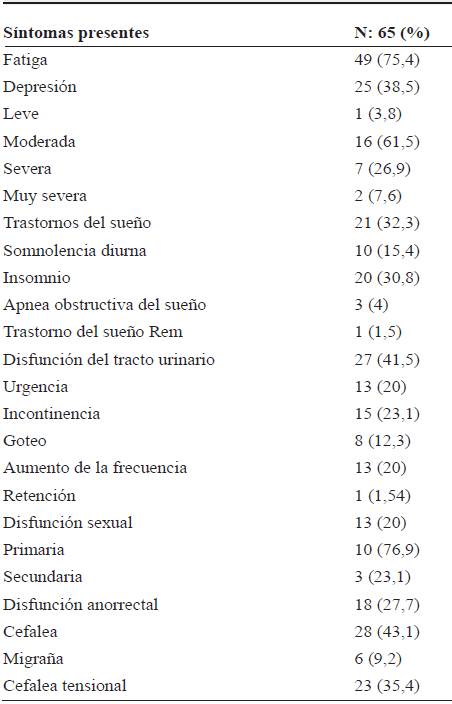 Se incluyeron 65 pacientes, el 72 % de sexo femenino. Síntomas presentes: fatiga (75 %), cefalea (43 %), disfunción urinaria (38 %), depresión (39 %), trastornos del sueño (32 %), disfunción ano-rectal (27 %) y disfunción sexual (20 %). En depresión, el 64 % presenta trastorno del sueño. El 50 % de los pacientes con fatiga y depresión tenía 9 años o menos de evolución de enfermedad y 11 años o menos en los que presentan disfunción urinaria.