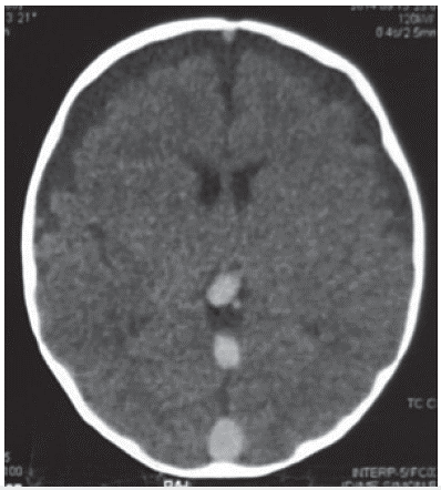 Figura 1: Tomografia axial computarizada cerebral en la que se evidenció una trombosis de todos los senos venosos cerebrales.
