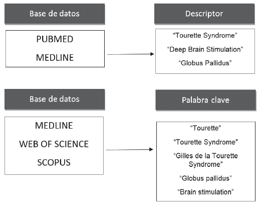 De acuerdo con el objetivo citado anteriormente, se realizó una búsqueda bibliográfica, durante los meses de febrero y marzo de 2017, en las bases de datos: Medline, Vubmed, Scopus y Web of Science. Para ello, se diseñó una ecuación de búsqueda en la que se utilizaron los términos "Tourette Syndrome", 'Deep Brain Stimulation", "Globus Valli-dus" como descriptores en Pubmed y Medline y, por otro lado, en las bases de datos Medline, Web Of Science y Scopus, los términos "Tourette", "Gilles de la Tourette Syndrome", "globus pallidus" y "brain stimulation" se emplearon como palabras clave (figura 1). Se obtuvo un total de 12 artículos.