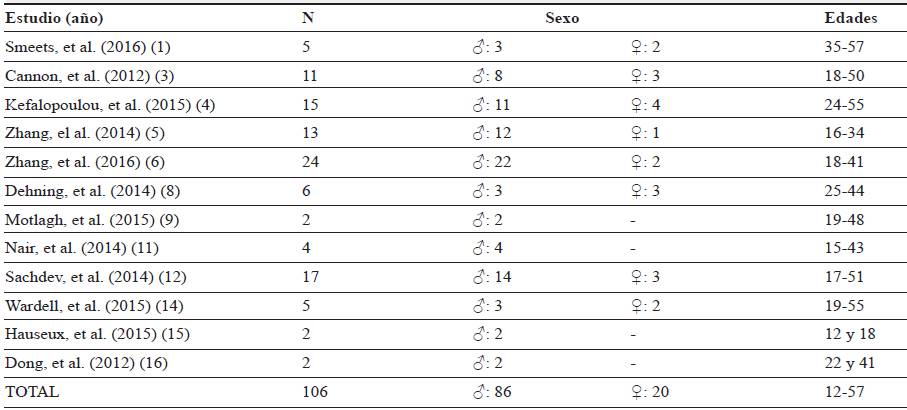 Tras la lectura y análisis de los artículos seleccionados, se observa que poco más de un centenar de personas participaron en el total de estudios, ya que las muestras son, por lo general, pequeñas; extendiéndose desde los 2 participantes 16 hasta los 24 6. Existe un claro predominio de participación masculina frente a la femenina; de los 106 participantes que conforman el total de los estudios, 86 son varones y 20 mujeres. Esto tiene clara concordancia con la prevalencia de la enfermedad, la cual afecta en general más al sexo masculino, en una razón de 4,3: 1 16. El rango de edades de los participantes abarca desde los 12 15 (solo 1 paciente; siendo, tras ello, la edad de 15 años 11 la que conforma el mínimo) hasta los 57 años 1 (tabla 1).