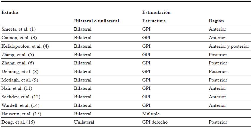Se hace notable que, en los últimos cinco años, la investigación realizada en torno a la ECP del globo pálido interno es escasa y que todavía hay una marcada carencia de ensayos controlados aleatorizados. Entre los artículos analizados para la elaboración de la presente revisión encontramos: 8 ensayos clínicos 1,3,4,6,8,9,11,12, 3 series de caso 5,15,16 y 1 estudio de simulación 14.