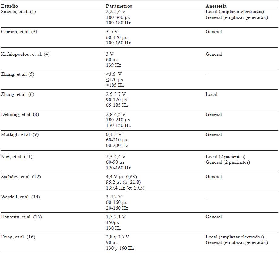 Tanto electrodos como generadores de impulsos se implantan a través de intervenciones quirúrgicas bajo anestesia general o local. Las zonas de emplazamiento de los generadores son la región subclavicular 3,5,6,8,11,12,16 y la región abdominal 1,4,8,15. En los artículos analizados, los modelos de electrodos (3387 o 3389) y los generadores de pulsos empleados (Activa PC, Soletra, Kinetra o IPG) pertenecen al mismo fabricante (Medtronic), salvo en el estudio de Nair, et al. 11, donde se hace uso, a mayores, de otro modelo de electrodos: ANS. El voltaje empleado para la estimulación se extiende desde un mínimo de 0,1 v 5,9 hasta un máximo de 5,6 1; el ancho de los pulsos va desde los 60 μs 3,4,9,11,14 hasta los 450 15; en cuanto a la frecuencia, van desde un mínimo de 20 14 hasta un máximo de 200 Hz 9. En la tabla 3 se recogen todos los datos referentes a los parámetros de estimulación, así como al tipo de anestesia empleada para la implantación de los diferentes dispositivos.