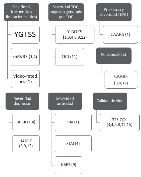 En lo relativo a los periodos de seguimiento de los pacientes, hay cierta variedad entre estudios (se extienden desde la primera semana posintervención 6,12 hasta más allá de los 60 meses 5,8,15), no así en cuanto a las variables a medir, donde se comparte el interés por cuantificar la reducción en la severidad de los tics, tanto vocales como motores, así como las limitaciones a las que se ven sometidos los pacientes a causa de ellos, a través de la Yale Global Tic Severity Scale (YGTSS), escala de referencia en el Síndrome de Tourette; presente en todos y cada uno de ellos. Se hace uso de otras escalas para la medición de diversas variables tales como la severidad de los TOC, TDAH, depresión, ansiedad, la calidad de vida o la funcionalidad de los pacientes (figura 2).