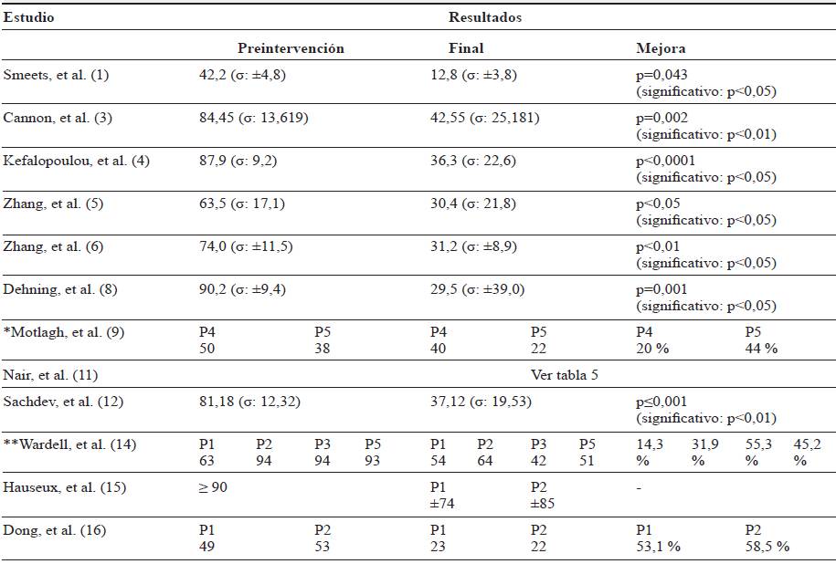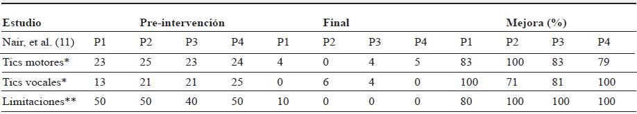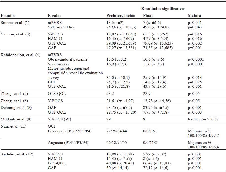 Tras la reunión de datos de preintervención, las intervenciones y la evaluación final de cada uno de los estudios, se observa que en 9 de los estudios se obtienen mejoras significativas (valor p<0,05 o disminuciones mayores del 50 %) en la YGTSS e, incluso, en el estudio de Nair, et al. 11 se objetivan remisiones completas en tics tanto motores como vocales, del mismo modo que en las limitaciones que estos causan (tablas 4 y 5). En los estudios de Smeets, et al. 1, y Kefalopoulou, et al. 4, estas mejoras también se reflejan en la escala modified Rush Video-based tic Rating Scale (mRVRS) con valores p-0,041 y p<0,0001, respectivamente.